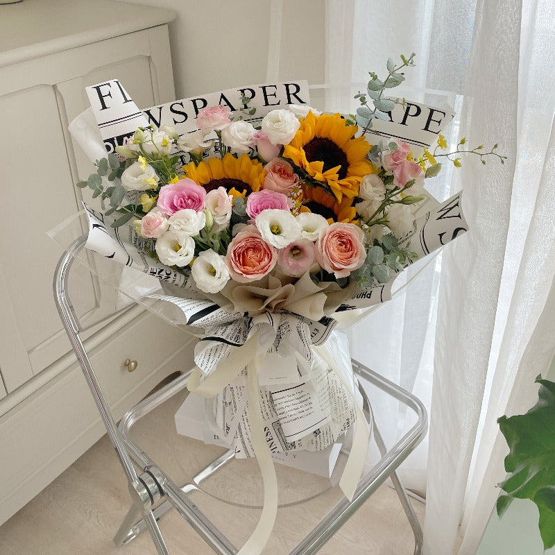 - Flower : Sunflower 3 stems , White Eustoma 8-10 stems , Champagne Rose 3 stems , Rose Pink 3 stems , Chamomile 3 stems with Eucalyptus.