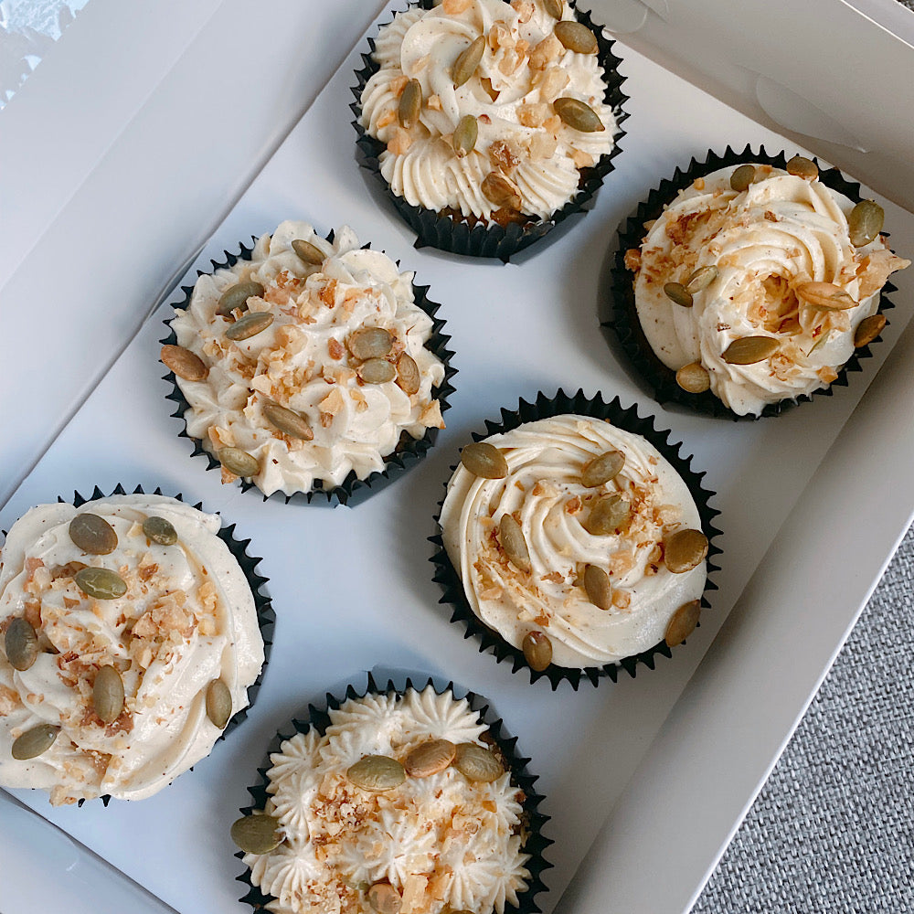 - A refreshing take on the classic carrot cupcake with pineapple chunks topped with our special cream cheese frosting, walnut bits, and pumpkin seeds.