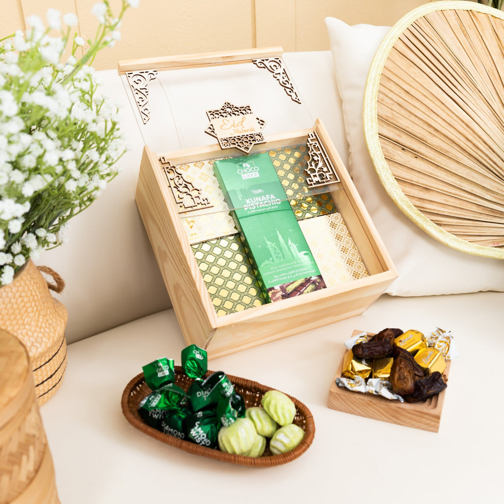 Made from premium wood with a sleek acrylic overlay, it features intricate decorative designs and a beautifully embossed “Eid Mubarak” greeting on the lid. Perfect for gifting or keeping your festive treats, jewelry, or keepsakes in style. Its compact size makes it ideal for door-to-door gifting or as a personal festive treasure.
