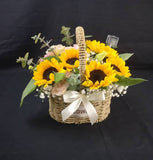 - Features 5 sunflowers, eustoma, baby breath and eucalyptus