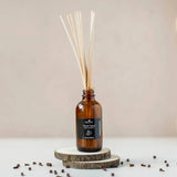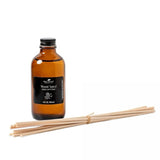 Our Reed Diffuser comes with a glass bottle with 4 ounces of our pre-diluted Wood Spice blend and 10 rattan reed sticks. Once the reeds are added to the bottle, the oil slowly travels up the reeds and releases scent into the air.