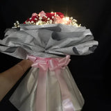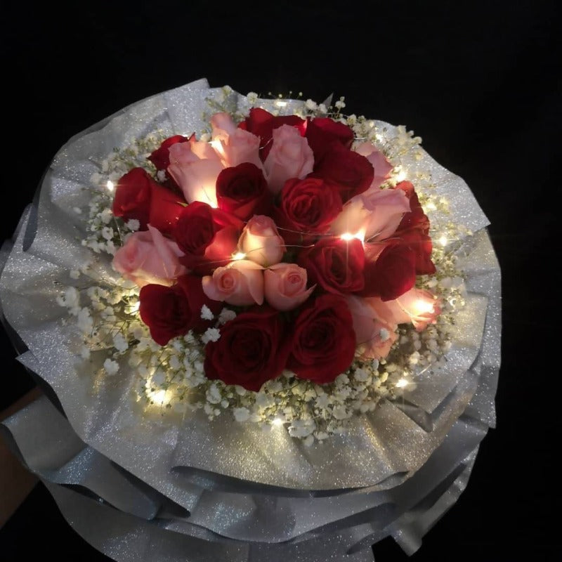 - Features 30 red and pink roses with baby breath and led light