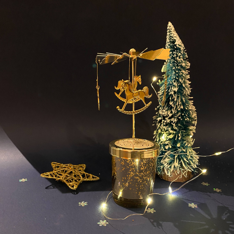How to use: Light the candle, put on the carousel ornaments and stand-holder. The carousel will spin due to the heat!